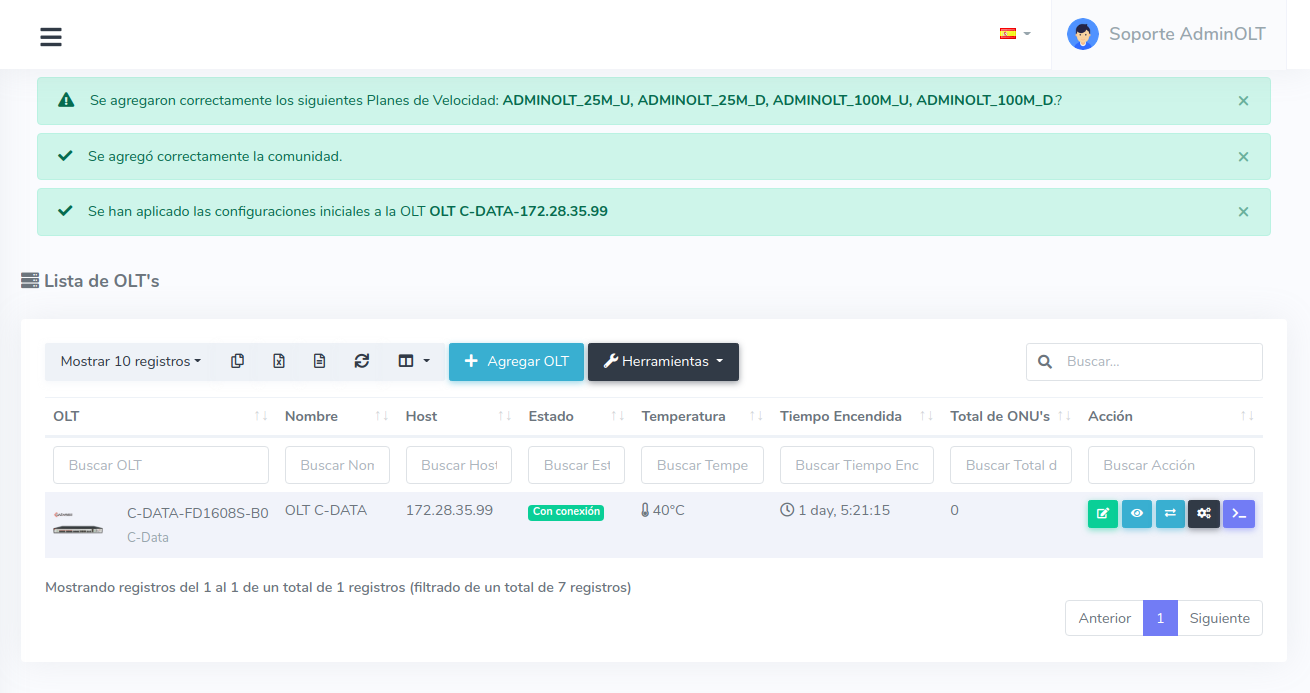 Al aplicar esta acción AdminOLT creará las comunidades que registró al momento de agregar la OLT en el sistema, de igual manera se creará un LineProfile que se usará al momento de autorizar una ONT esto implica la creación de una DBA y por último se crearán unos Traffic Tables.
