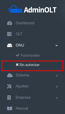 Al conectar un dispositivo ONU a la OLT esta debe ser autorizada para poder establecer la conexión, para ver los dispositivos que aun no han sido autorizados debemos dirigirnos a la sección ONU > Sin Autorizar.