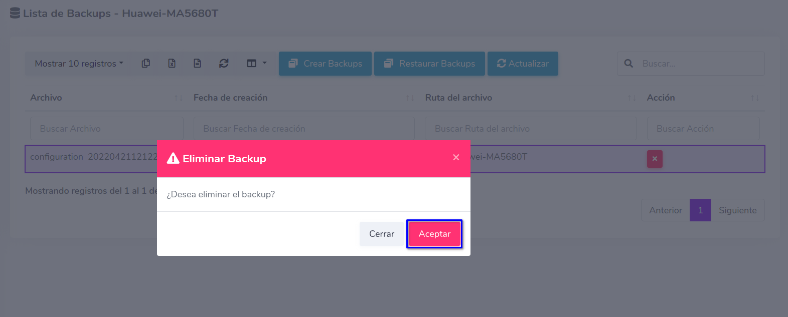 De click al botón con el símbolo X perteneciente al respaldo que desea eliminar