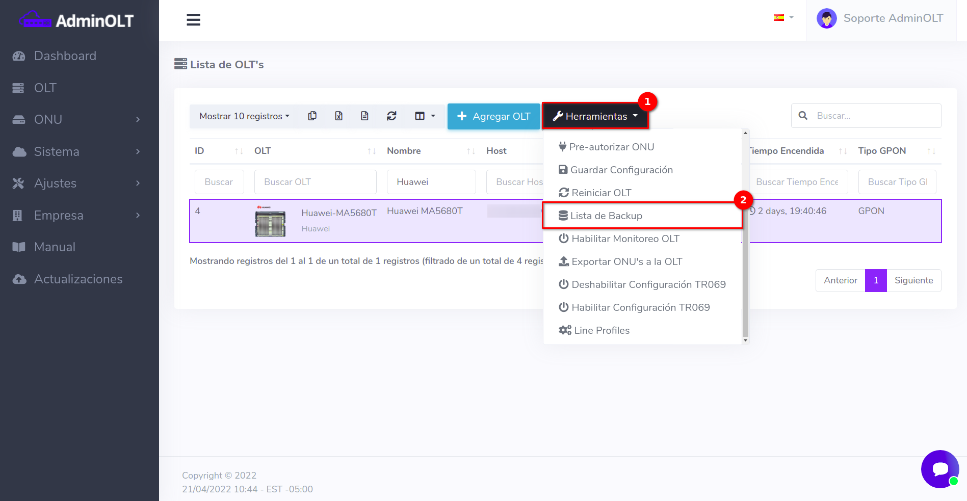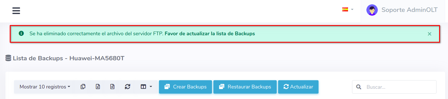 Al realizar estos pasos en su terminal, la OLT creara y mandara un respaldo en el servidor FTP de AdminOLT, el cual puede ser visualizado en la Lista de Backups