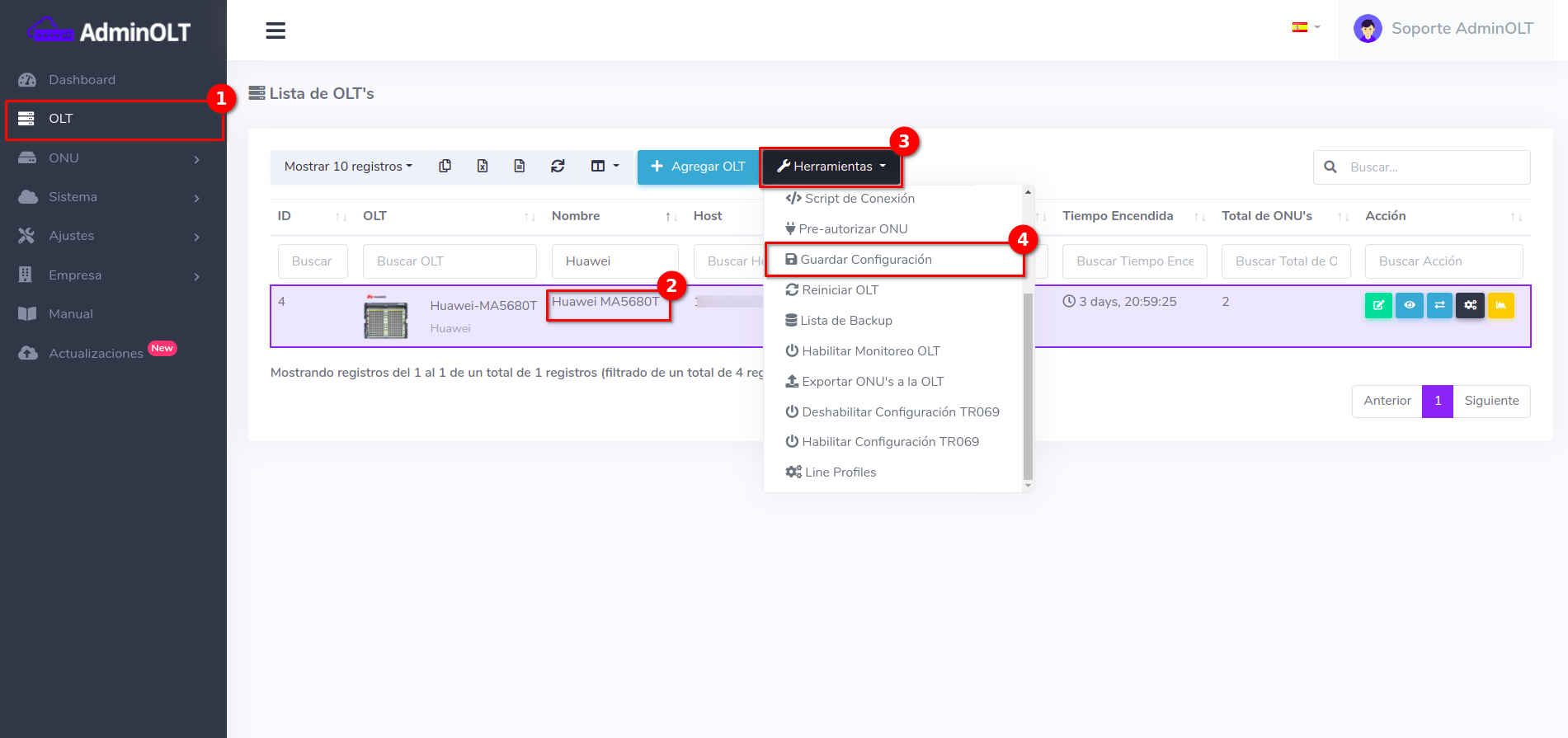 El sistema AdminOLT ofrece un acceso a un servidor FTP para el usuario. Esta información se configura en la OLT donde está última a base de los comandos específicos enviara la información al servidor antes mencionado. Si tiene dudas sobre donde conseguir estos accesos, puede consultar el siguiente manual. Usuarios FTP