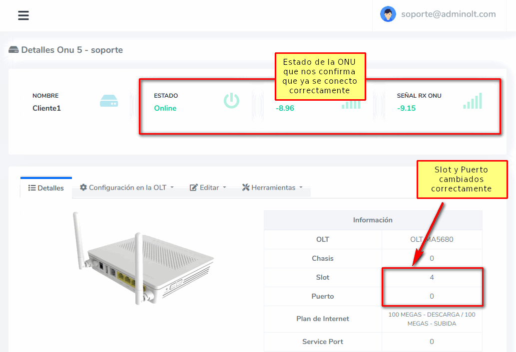 7 Cambiar ONU de Slot y Puerto fisicamente y verificar estado de la ONU