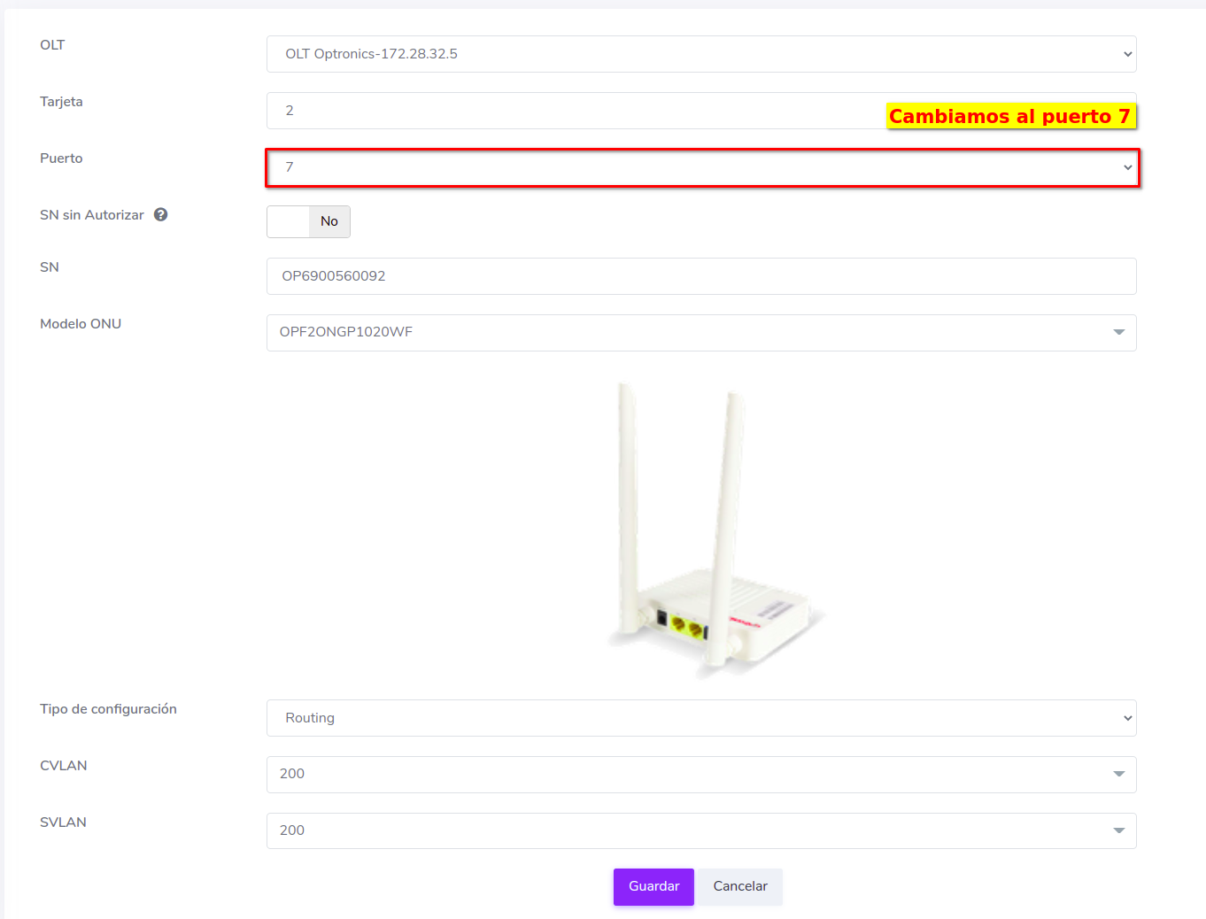 En este ejemplo la ONU se encuentra en en el Puerto 1; lo pasaremos al Puerto 7. Antes de editar verifique que la ONU cuente con servicio
