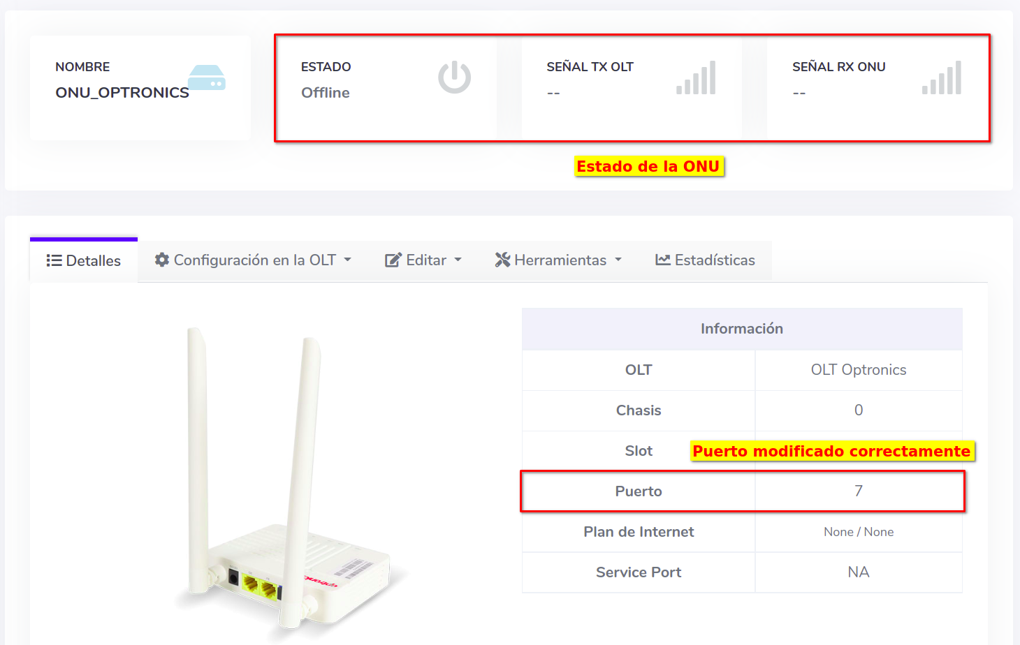 En este momento si vemos el estado de la ONU, este se encuentra en Offline debido a que físicamente no sé ha cambiado la ONU de Puerto, pero en AdminOLT si se ha actualizado la información.