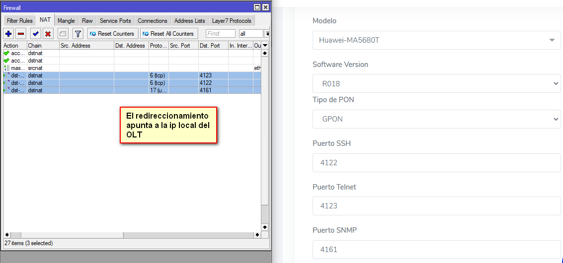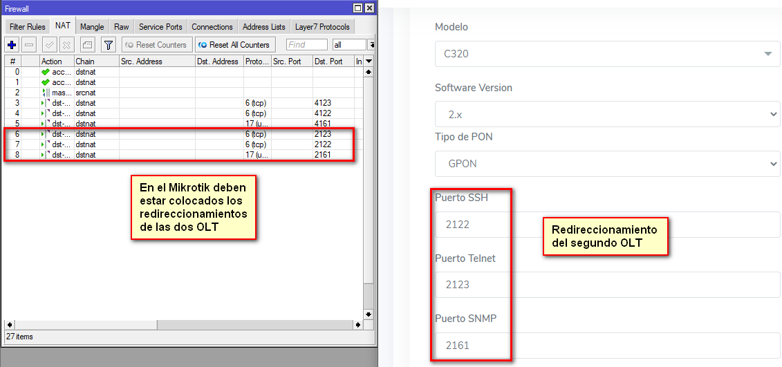 Como no se puede usar los mismos puertos para ambas OLT debido a que cada una apunta a la ip local del OLT, se tiene que modificar el número de redireccionamiento de puertos.