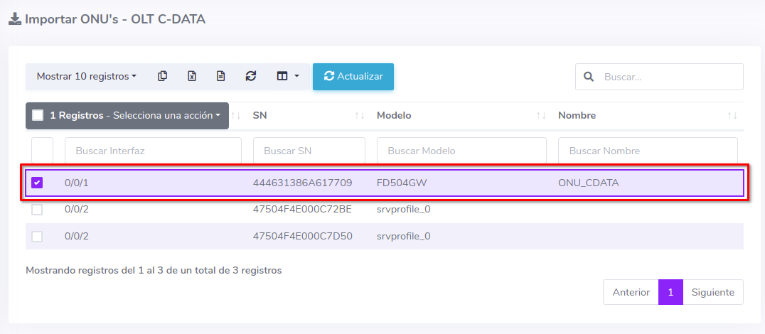 3Una vez que hayamos seleccionado los equipos, importamos las ONU's al sistema AdminOLT