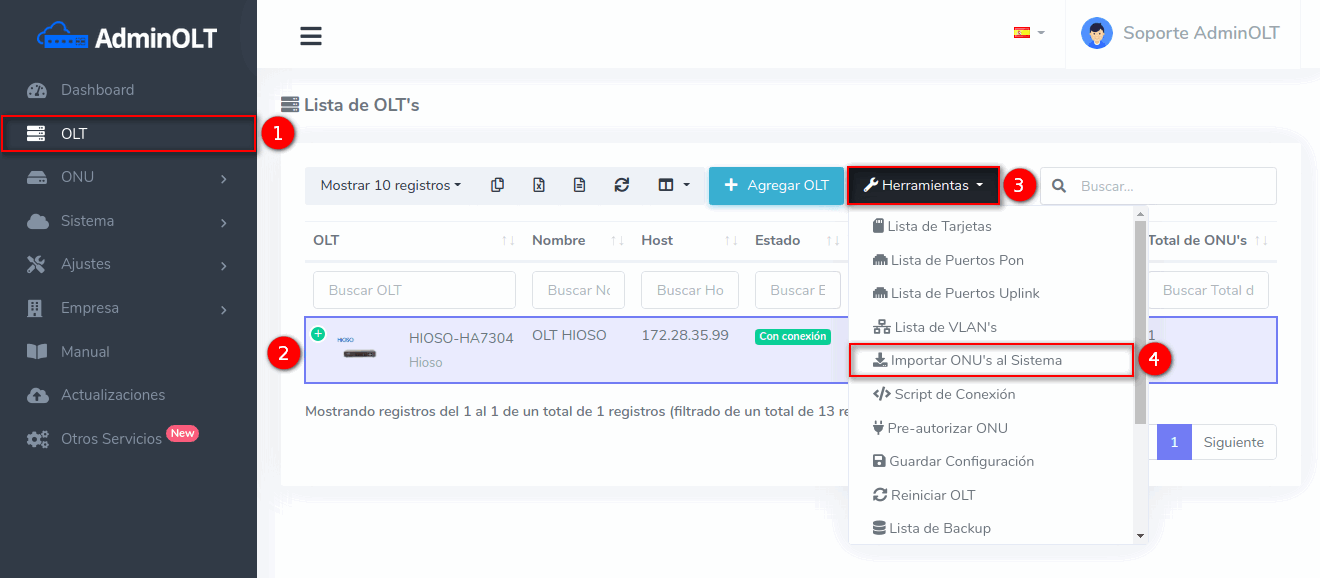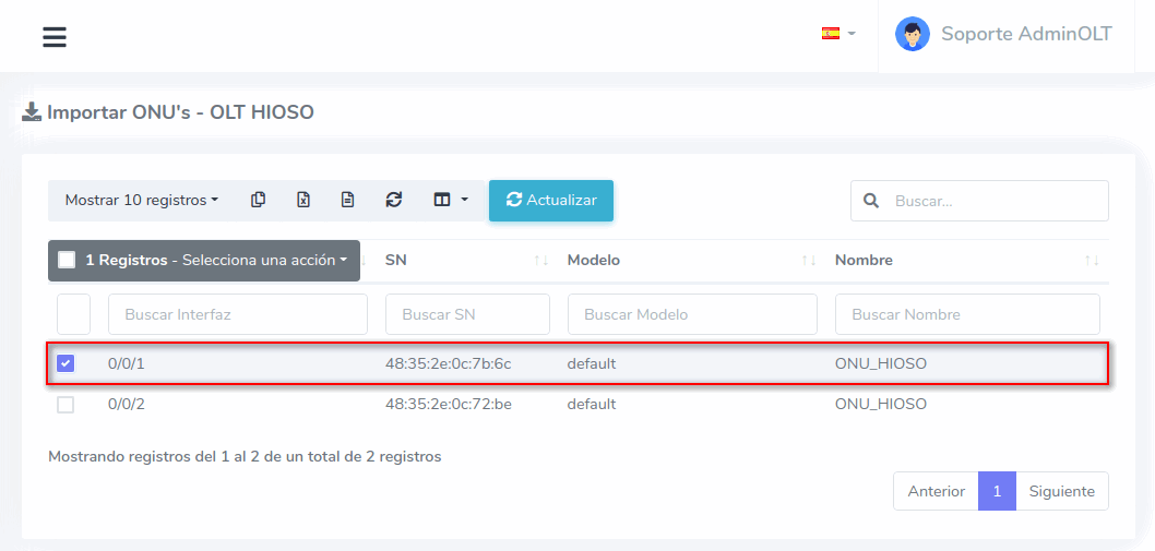 3Una vez que hayamos seleccionado los equipos, importamos las ONU's al sistema AdminOLT