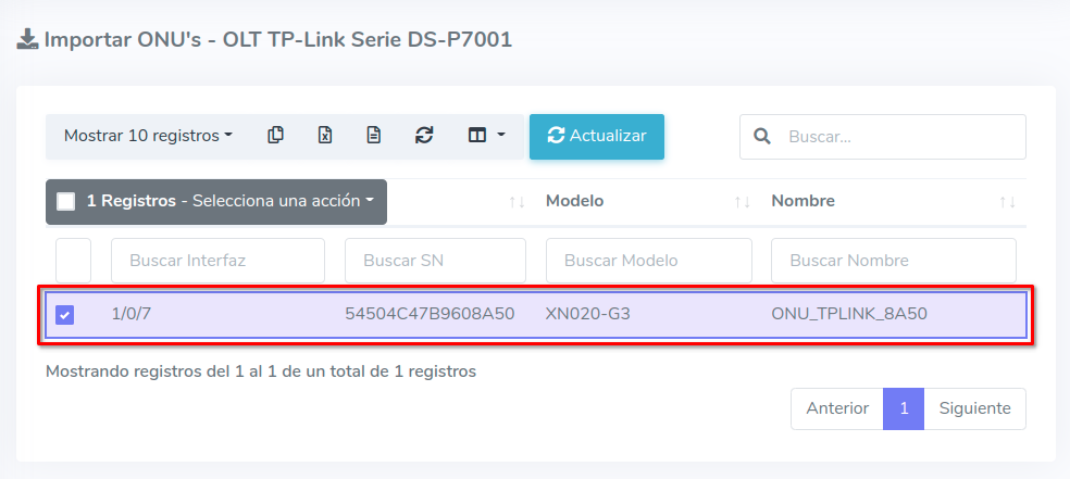 3Una vez que hayamos seleccionado los equipos, importamos las ONU's al sistema AdminOLT
