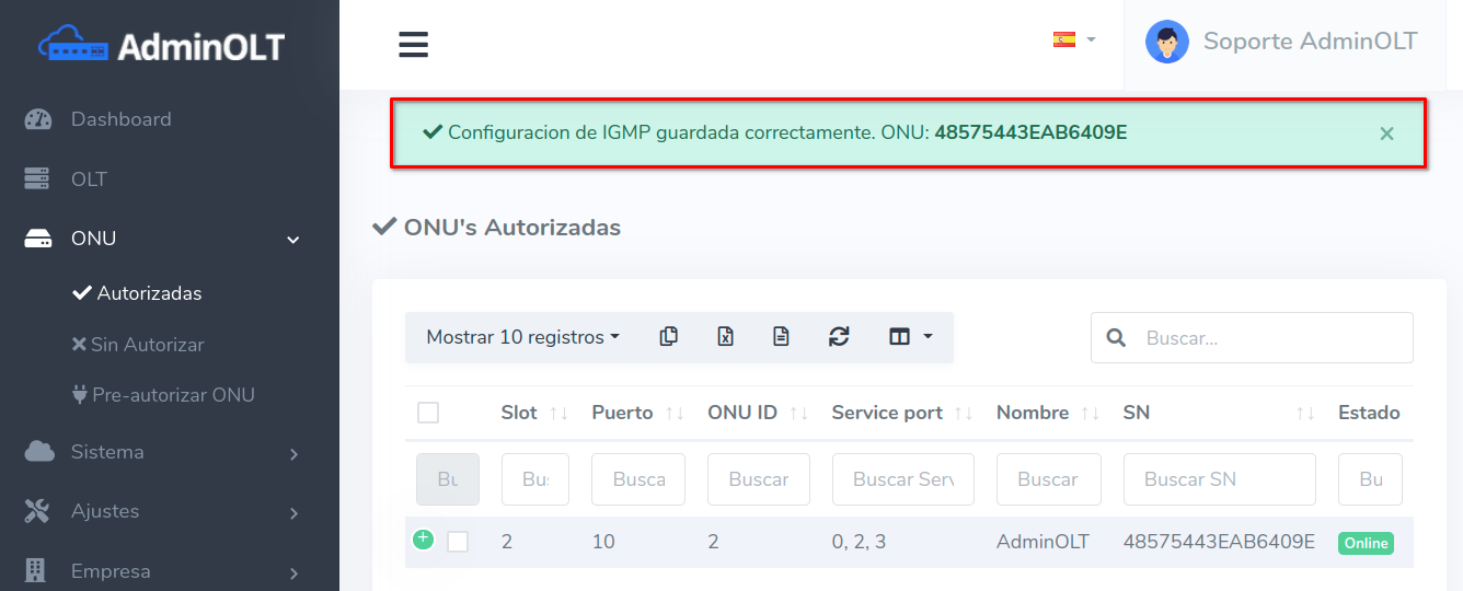 1Para poder agregar una Configuración IGMP, debemos dirigirnos a la sección ONU > Autorizadas. Seleccionamos la ONU con la que vamos a trabajar y damos click en el botón con la leyenda TR069 > Configuración IGMP TR069.