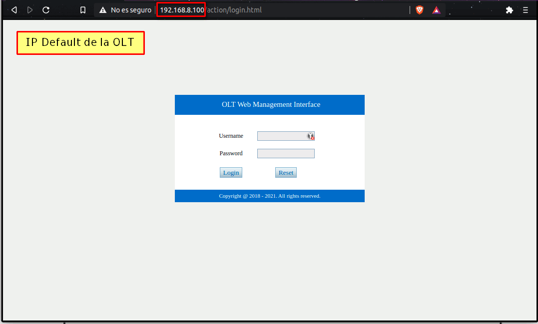 Para gestionar la OLT, es necesario acceder a su interfaz web utilizando la dirección IP predeterminada asignada. Se recomienda usar el navegador Firefox por su compatibilidad y rendimiento en este tipo de tareas. Sigue estos pasos: