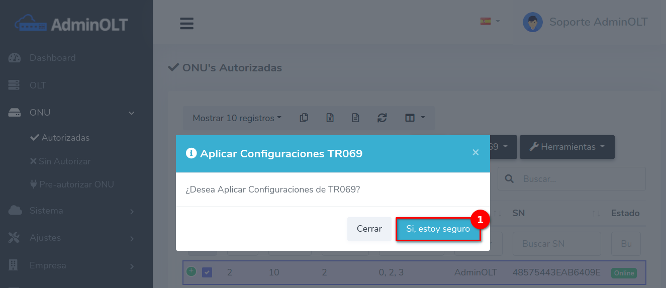 1Nos dirigirnos a la sección ONU > Autorizadas. Seleccionamos la ONU a la que vamos a agregar la WAN IP, damos Clic en TR069 > Aplicar Configuraciones TR069. Para seleccionar la opción con la leyenda Aplicar Configuraciones TR069