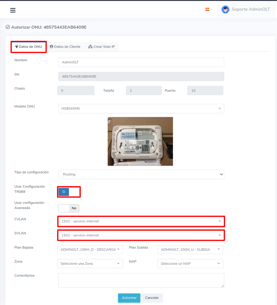 2Al seleccionar la opción autorizar ONU podremos ver el siguiente formulario con los detalles de la ONU, podemos asignarla a la VLAN, establecer la velocidad de subida y bajada, además como adicional ya se puede elegir Usar Configuración TR069, entre otras opciones.