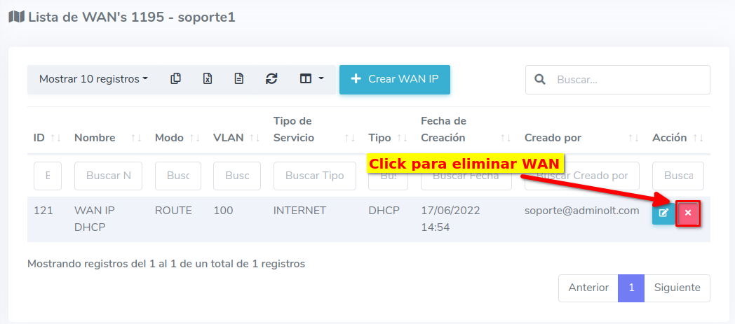 2Seleccione la opción Crear WAN IP y complete el formulario, con este proceso podrá autorizar y crear una WAN IP a una ONU al mismo tiempo.