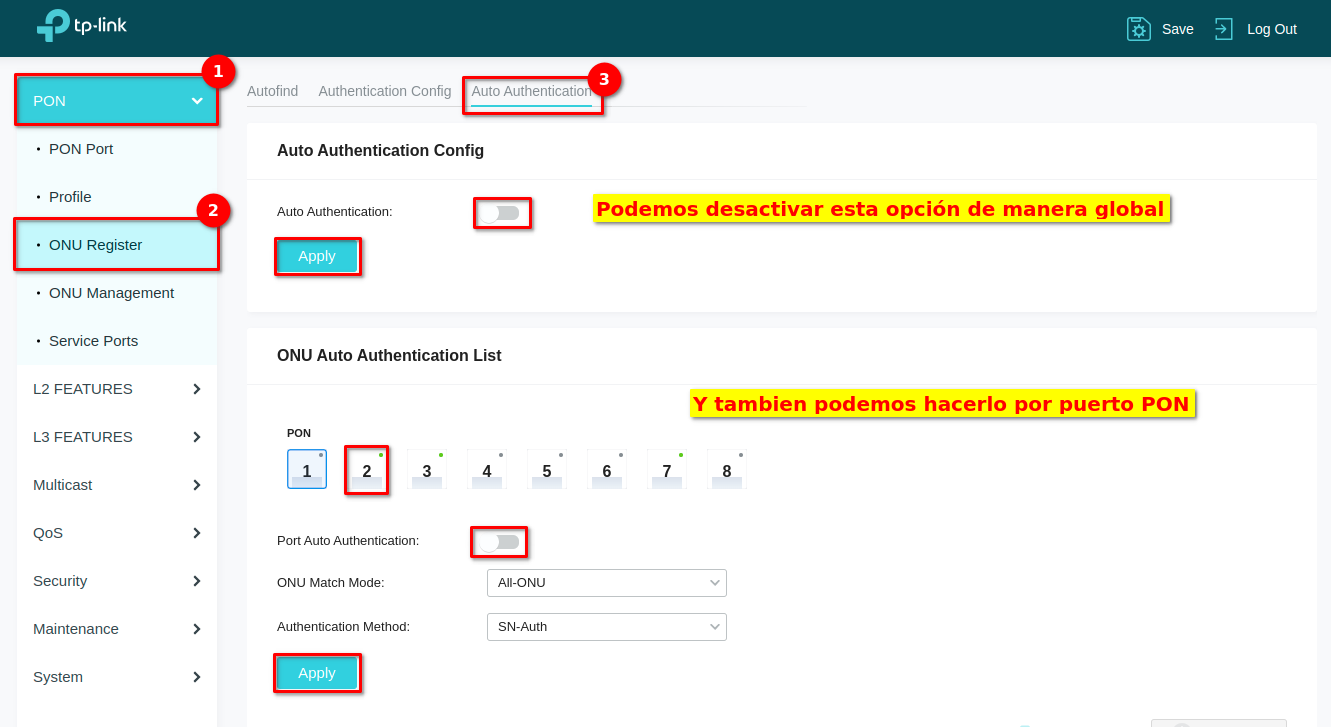 1 Entramos a la interfaz web de nuestra OLT e iniciamos sesion y deshabilitamos el modo Auto Authentication