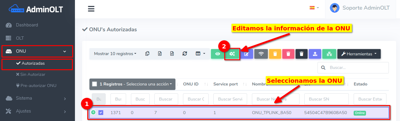 En AdminOLT podemos editar información de una ONU Autorizada en la OLT, supongamos que alguna de las ONUs que tenemos autorizadas en el sistema se estropea. Tomaremos como ejemplo esta situación para explicar el propósito de esta función. Así que en ese caso en AdminOLT al editar ONU por SN podemos tomar información de alguna ONU no Autorizada y usarla, sin perder la configuración inicial que teníamos.