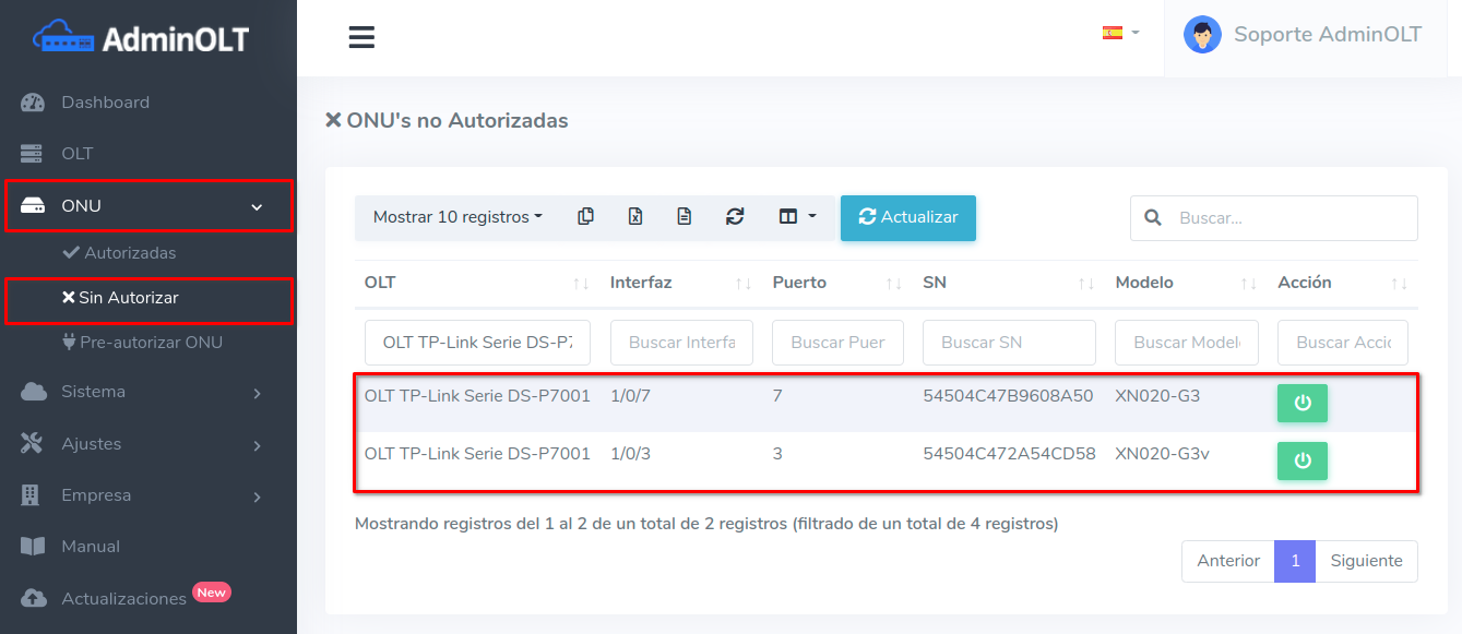 Esta función puede cambiar automáticamente datos como por ejemplo el Modelo de ONU, puerto y Tarjeta.