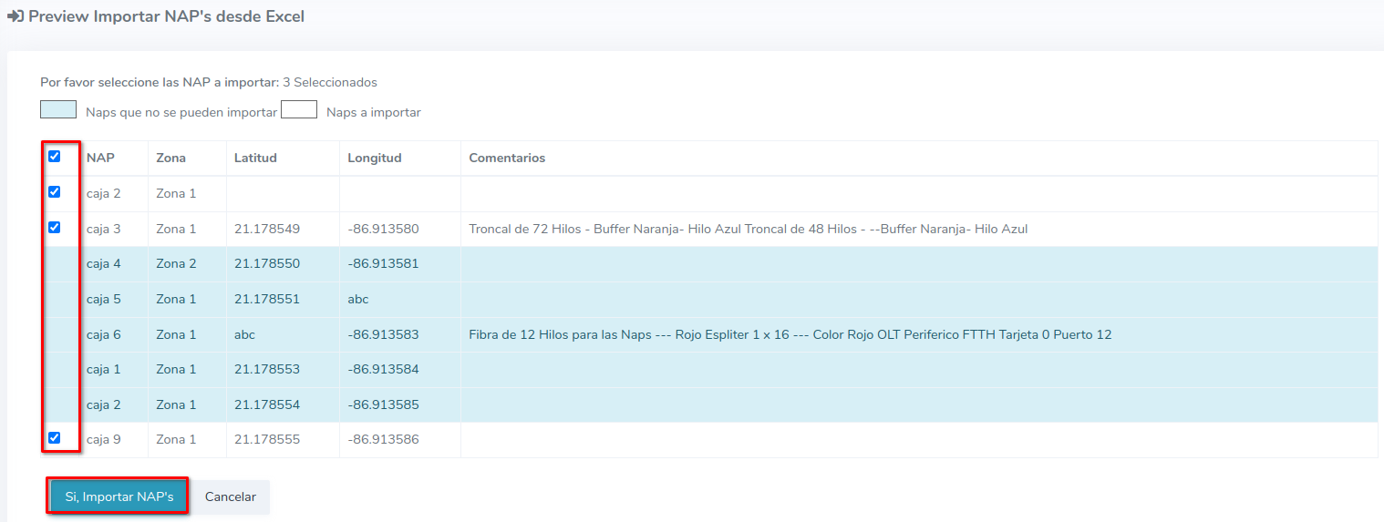 4Al terminar de verificar los datos puede elegir una o todas las Naps para importar.