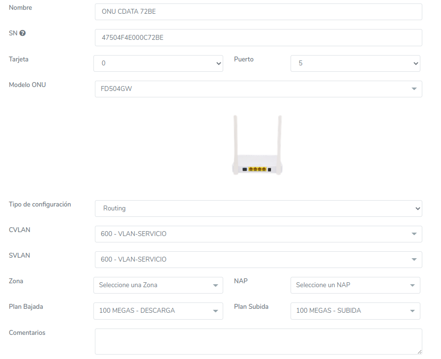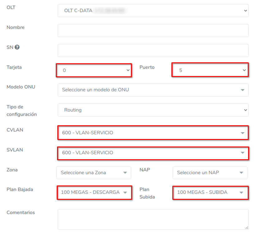Es necesario que como primer paso sea seleccionar la OLT donde se realizara la acción. Al momento de seleccionar alguna OLT, se autocompletarán algunos datos del formulario, por ejemplo Tarjetas, Puertos o VLAN.