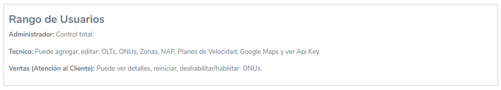 Ventas (Atención al Cliente): Este rol está diseñado para el equipo de atención al cliente o ventas. Los usuarios con este acceso pueden ver detalles de las ONUs y tienen la capacidad de reiniciar, habilitar o deshabilitar ONUs, pero no pueden modificar configuraciones complejas del sistema