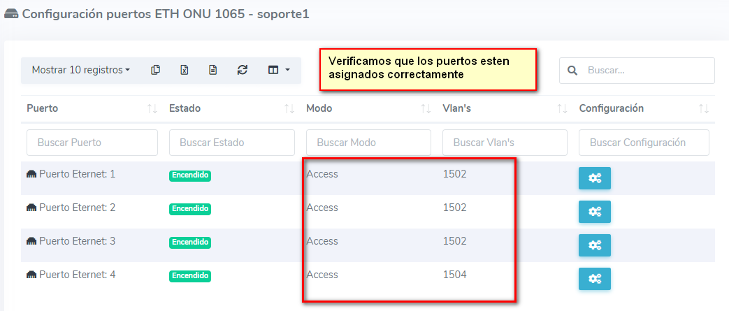 Como primer punto, seleccionamos la onu que autorizamos y vamos a la opción de configurar puertos ETH