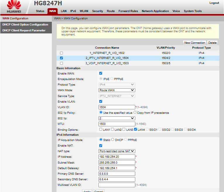 Para la creación de la WAN IP de IPTV usaremos la siguiente información
